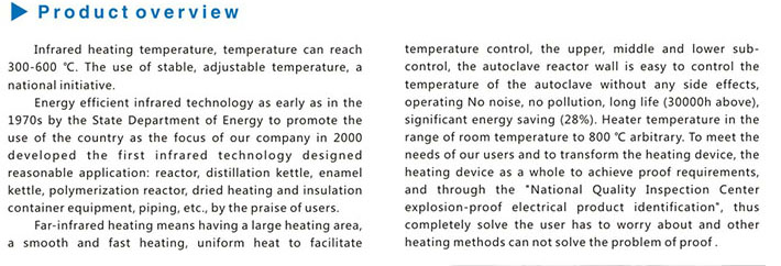 采用红外线温度加热,使用温度可达到300—600℃。使用稳定,温度可调,国内首创。高效节能的红外技术早在70年代由能源部向全国作重点推广应用,我公司于2000年率先研制将红外技术精心设计,合理应用在:反应釜、蒸馏釜、搪瓷釜、聚合釜、干燥设备、管道等容器上加热和保温,深受用户的一致好评。