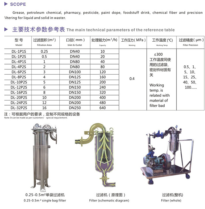 产品概述: ![]() D L series bag filter is a new structure,small size,easy,operation and flexible, energy efficient sealing work adaptable multipurpose filtration equipment ,it is widely used in chemical ,coatings,paints ,food and other industries。 产品特点: 改种过滤机是一种压力式过滤装置,待滤液在泵的作用下,滤液通过所需精度等级 的滤袋能够获得合适的滤液。该机更换滤袋十分方便,过滤基本无料消耗。该机有单机 过滤,双机过滤,并可配套输送泵组装在移动式推车上。过滤机滤袋保护网均为不锈钢 制作,材质有碳钢、不锈钢、塑料等,供过滤不同介质的用户选择。 To filter is a kind of pressure filter device, the filtrate under the action of a pump, the filtrate through the required accuracy level of the filter bag can obtain proper filtrate.The machine to replace the filter bag is very convenient, without the basic filter material consumption. This machine has a single filter, dual tiltration dual and supporting the pumpassembly in a mobile cart. Filter bag protecting net is made of stainless steel, carbon steel, stainless steel, plastic materials, filter medium for different user selection. 适用范围: 油脂、石油化工、制药、农业、油漆、涂料、食品、化纤、废水中的固液精密过滤。 Oil, petrochemical, pharmaceutical, agriculture, paints, coatings, food, chemical, was tewater solid-liquid microfiltration. ![]() | ||||
