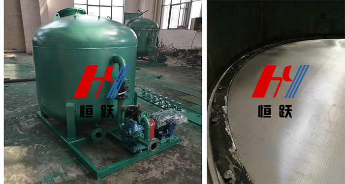 用原油、废油、脏油等比较脏的液体的固液分离作业,齿轮泵将待滤液经进液管泵入罐内,并充满,在压力的作用下,滤液中的固体杂质被滤液上的滤砂截留,滤液透过滤砂经滤网进入出液管流出罐体,从而得到清晰的滤液。随着过滤时间的增加,被截留在滤砂上的固体杂质越来越多,使滤渣不断增加,这样使过滤阻力增大,罐内压力升高,当压力升到一定值时需要更换滤料,停止向灌内输入待滤液并将压缩空气经进气管吹入罐内,将罐内待滤液压入其他容器内,将滤液排光。关闭压缩空气,打开卸料,将滤网上的滤渣经罐体下方卸料口排出。 将滤渣清理完成后关闭卸料口,打开装料口将准备好的过滤砂均匀地装入脱色罐内,将过滤砂装至4成即可,将装料口密封,换砂过程完成。